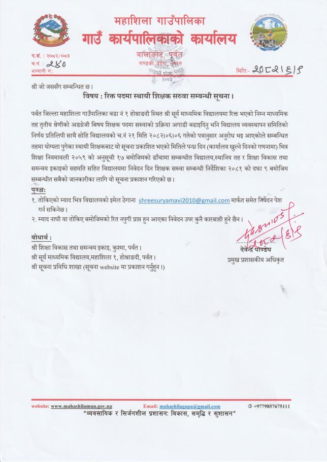 श्री सूर्य मा.वि.को निम्न माध्यमिक तह तृतीय श्रेणी अंग्रेजी विषय रिक्त पदमा स्थायी शिक्षक सरुवा सम्वन्धि सूचना ।