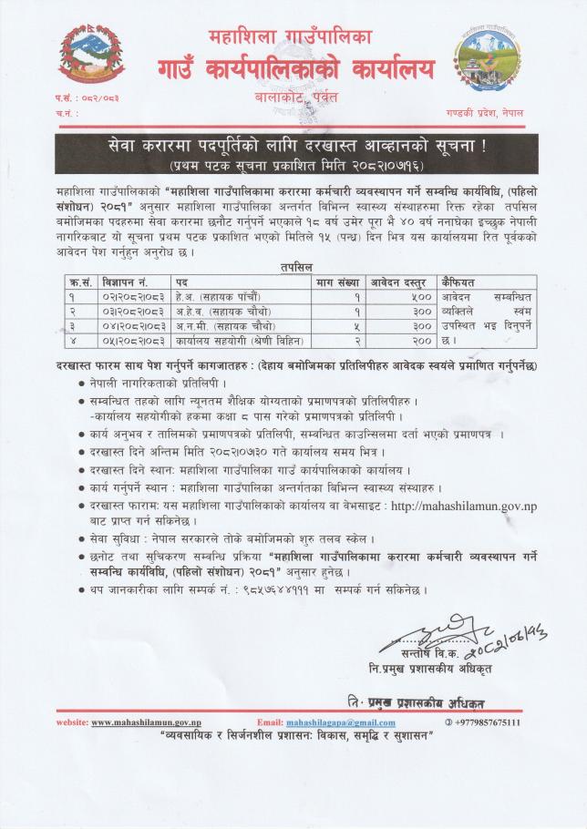 » सेवा करारमा पदपूर्तिका दरखास्त आह्वानका लागि सूचना ।