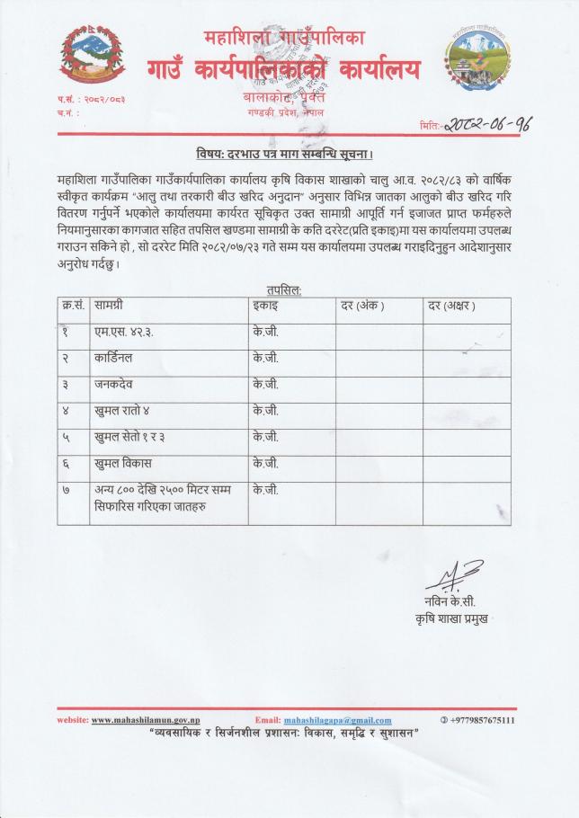 आलु तथा तरकारी वीउ खरिदका लागि दरभाउपत्र माग सम्वन्धि सूचना ।