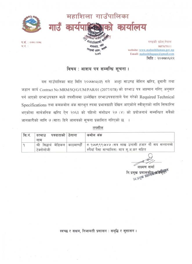महाशिला शिला क्षेत्रमा कार्यको वोलपत्र स्वीकृत गर्ने आशयको सूचना ।