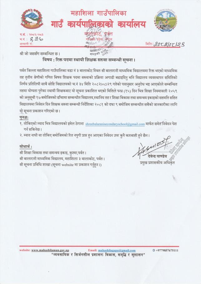 श्री बालारानी मा.वि.को माध्यमिक तह तृतीय गणित विषय रिक्त पदमा स्थायी शिक्षक सरुवा सम्वन्धि सूचना ।