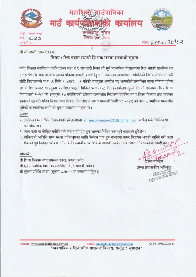 » श्री सूर्य मा.वि.को प्राथमिक तह तृतीय श्रेणी रिक्त पदमा स्थायी शिक्षक सरुवा सम्वन्धि सूचना ।